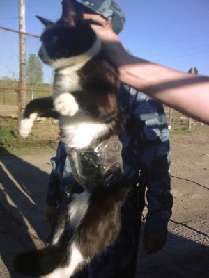 Os serviços penitenciários regionais publicaram uma fotografia do gato preto e branco, sendo segurado pela pele do pescoço por um guarda, com sua carga presa por uma fita adesiva.